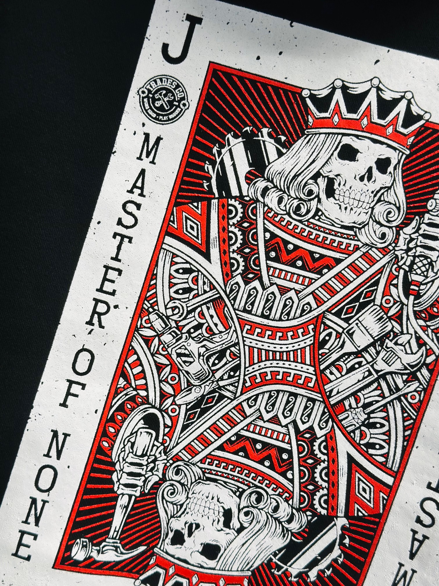 - Back: Large “Master of None” playing card design featuring skull king