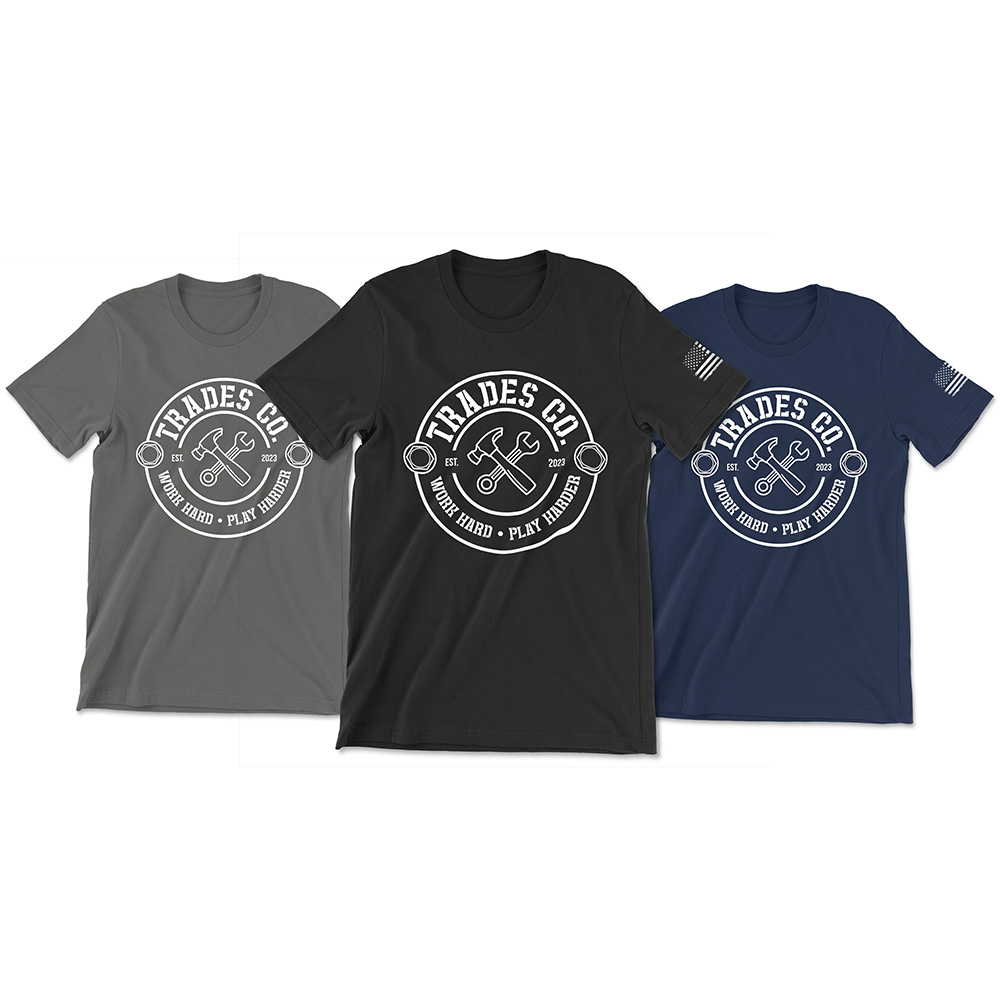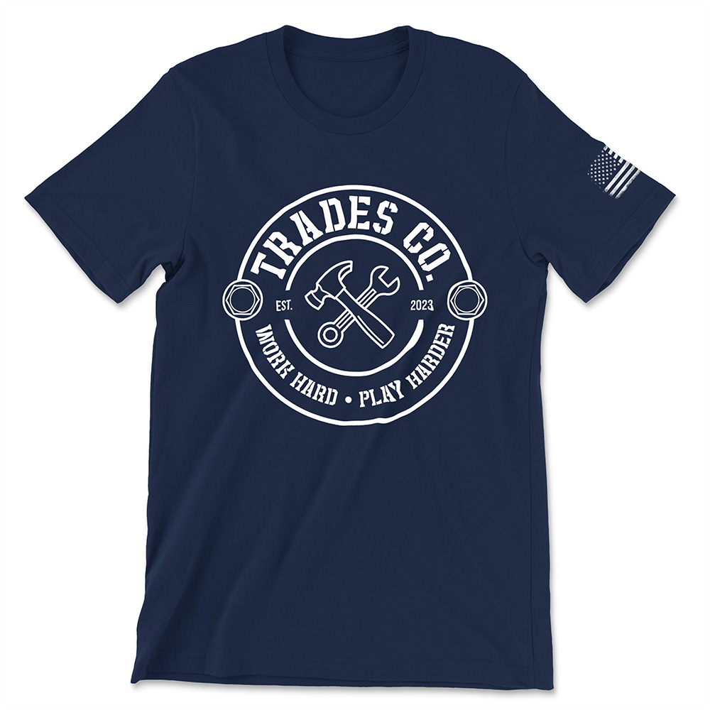 Our signature TradesCo heritage badge design featuring crossed hammer and wrench tools. This premium American-made cotton tee combines comfort with authentic trades pride. Perfect for work, weekends, or showing your skilled craftsman spirit.